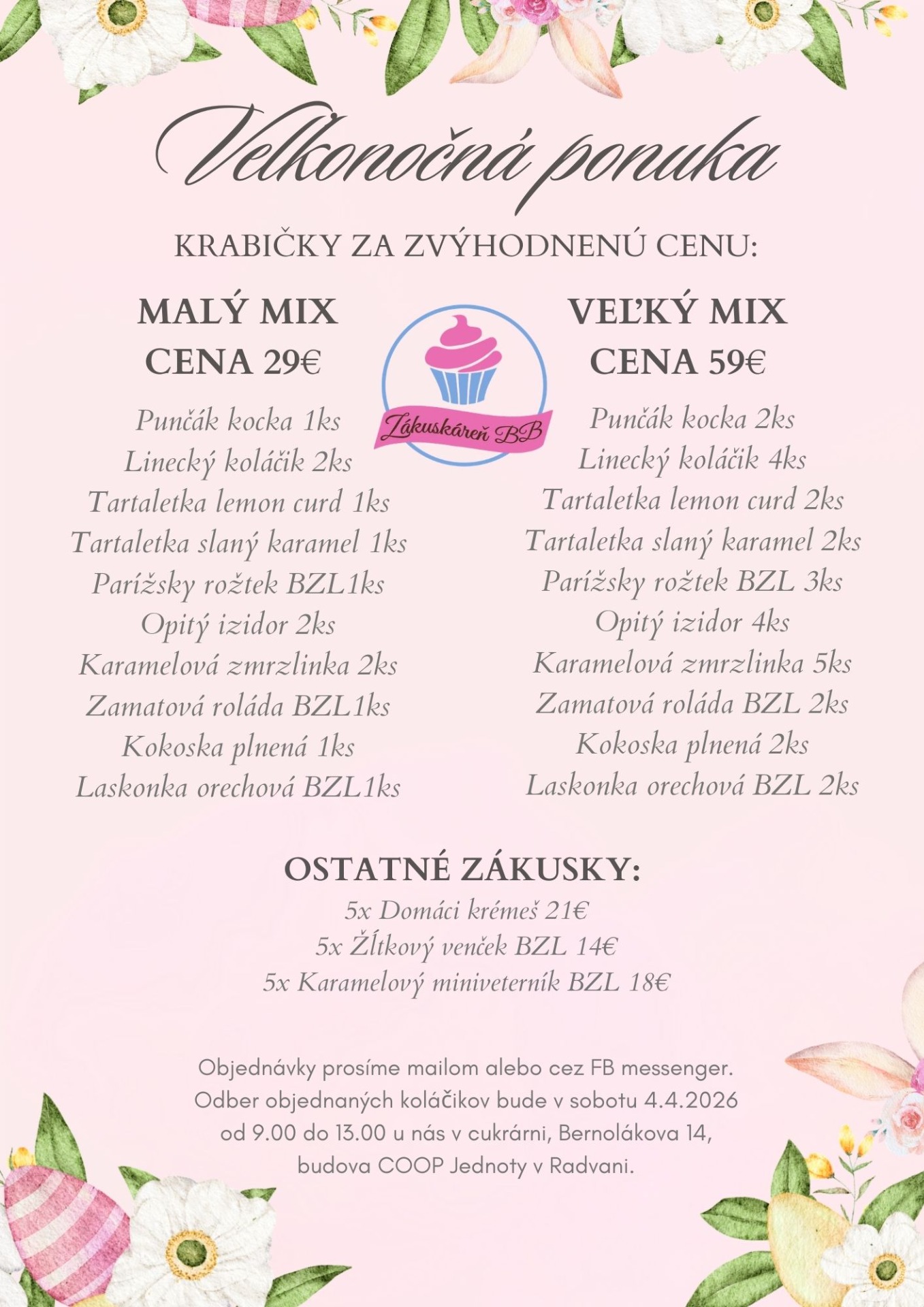 Vaše objednávky stále prijímame cez messenger a email. Odber koláčikov: v sobotu 4.4.2026 medzi 09:00 - 13:00.